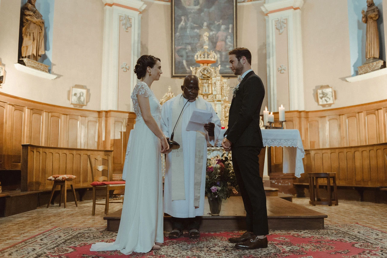 La cérémonie à l’église a été le cœur de cette journée. Les discours poignants, les échanges de vœux et les regards échangés ont été des moments d’une intensité rare. Chaque parole prononcée résonnait dans l’enceinte sacrée, chaque sourire et larme partagée témoignaient de l’amour profond entre Héloïse et Gautier. En tant que photographe de mariage à Annecy, mon rôle était de capturer ces instants avec tact et sensibilité, pour que le couple puisse revivre ces émotions pour toujours.